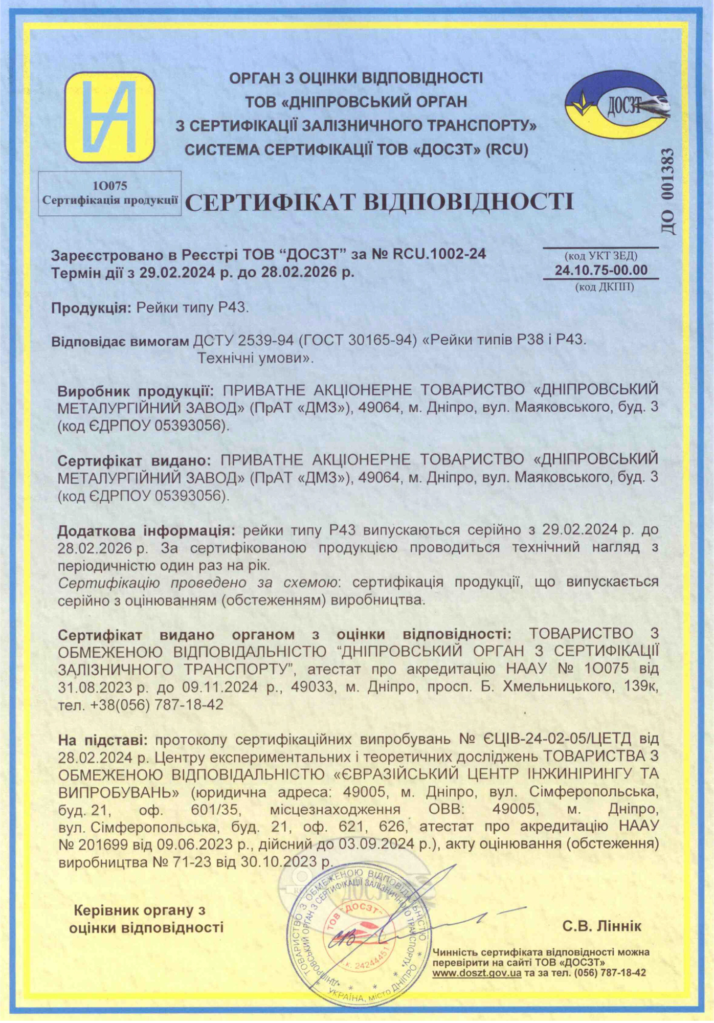 - Сертифікат відповідності рейок рудникових типу Р43 (завантажити)