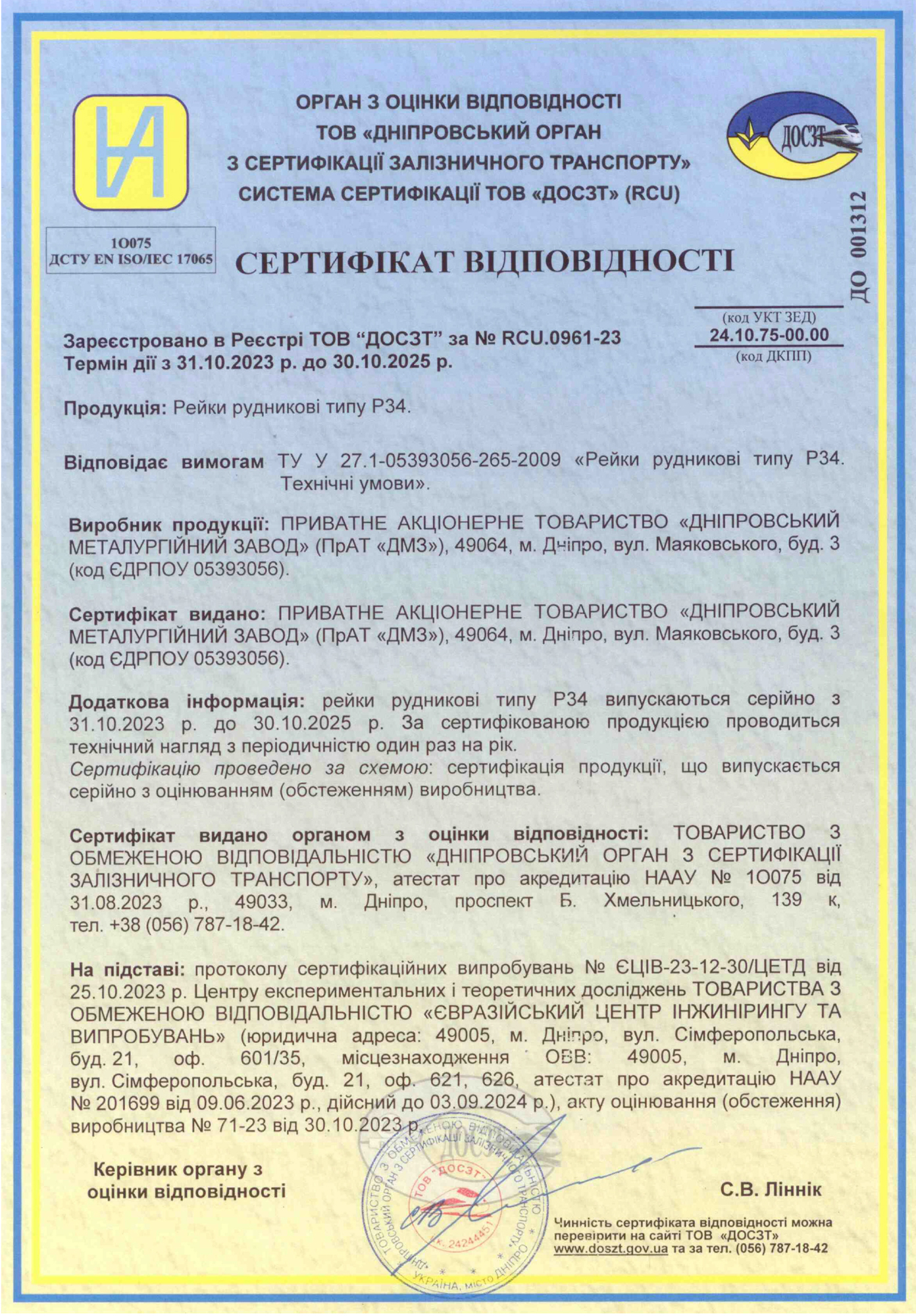 - Сертифікат відповідності рейок типу Р34 (завантажити)